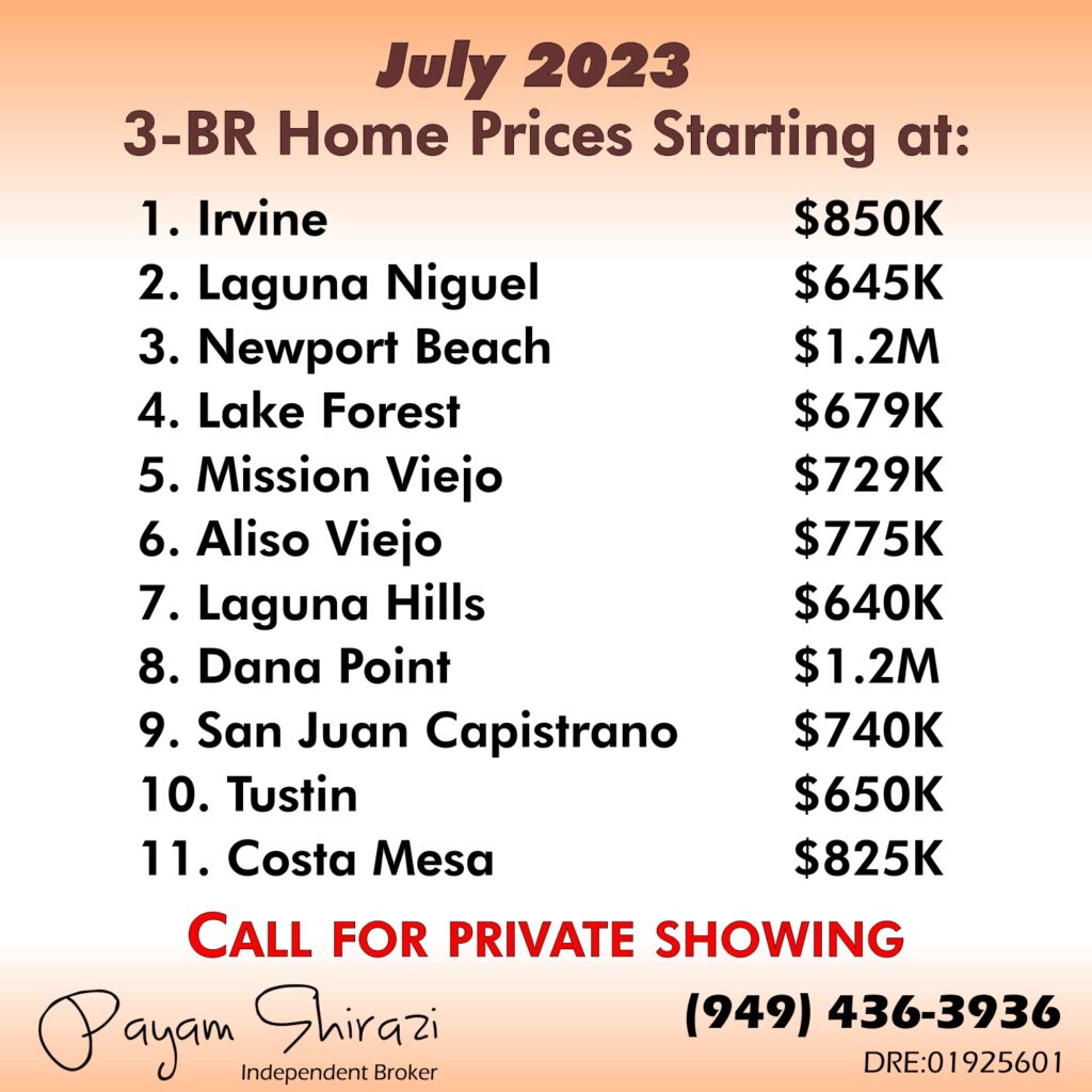 Starting Prices for 3 BR Homes in Southern California California July 2023